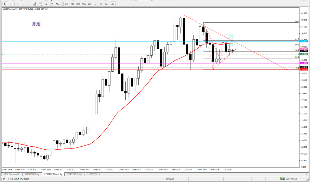 今月の月足は現在のところそれよりも小さな上下の髯のある陰線の為まだ方向感は見えにくい。